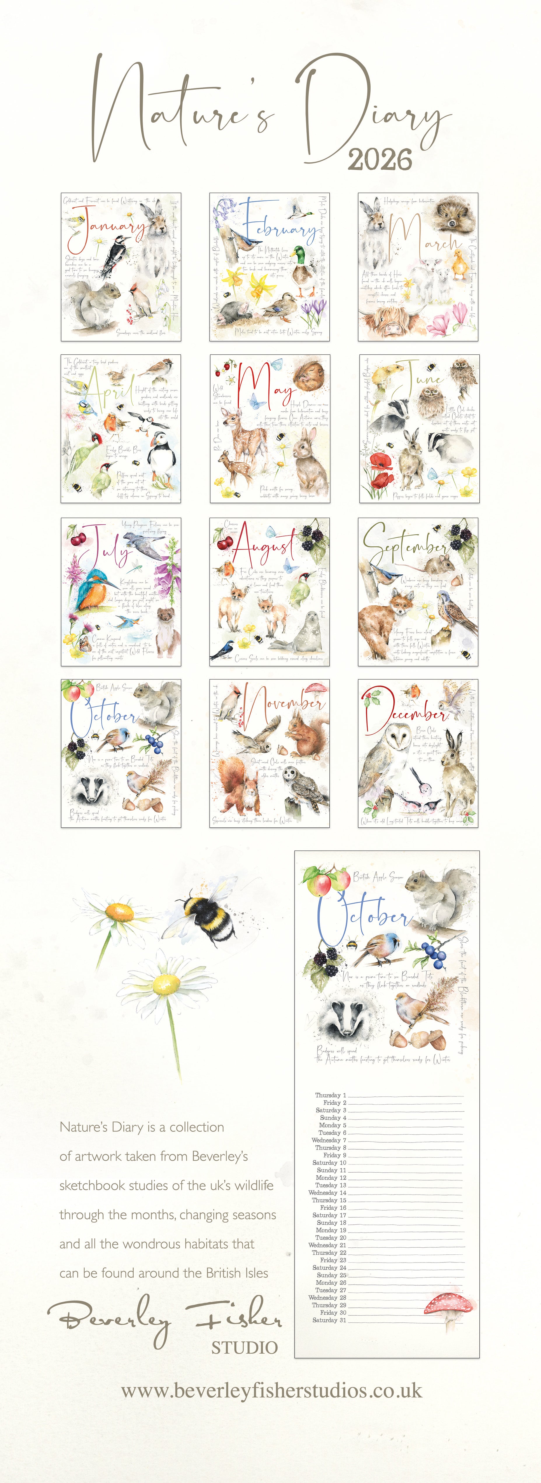 Get organised with this slim Nature's Diary Calendar. Illustrated by Beverley Fisher and taken from her studies of the UK's Wildlife through the ever changing months.